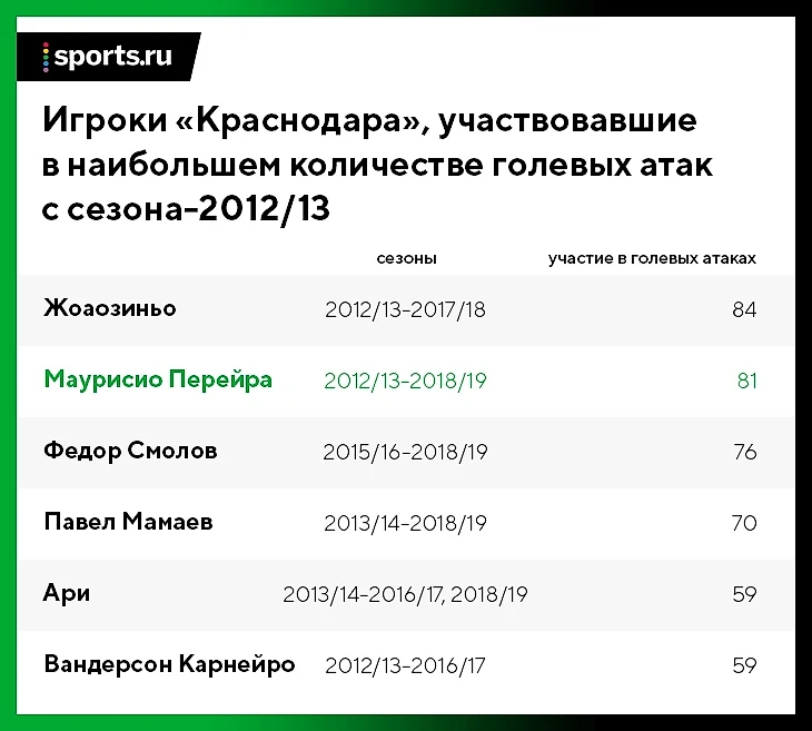 Прошлой зимой болельщики «Краснодара» выбирали символическую сборную первых десяти лет в клубной истории. Лучшим центральным полузащитником признали Маурисио Перейру – он набрал 34% голосов (Мамаев – 21%, Ахмедов – 18%). Такой выбор, возможно, кого-то удивил: Перейра редко забивает (4 гола с сезона-2015/16), не дает громких интервью, не попадает в скандалы, а просто очень качественно доставляет мяч к чужой штрафной.
