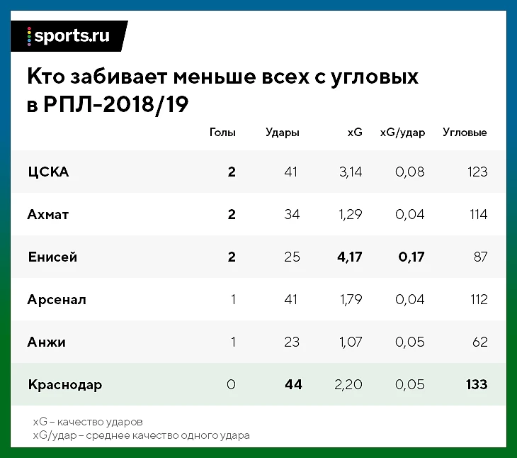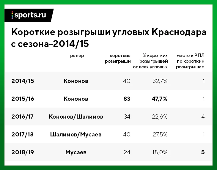 В РПЛ-2018/19 с угловых забили 15 команд – все, кроме «Краснодара». При этом по количеству ударов после угловых команда Мусаева – пятая в лиге («Локо», «Рубин» и «Оренбург», забившие по 7 голов, бьют реже).
