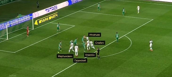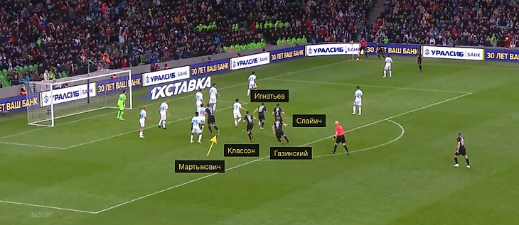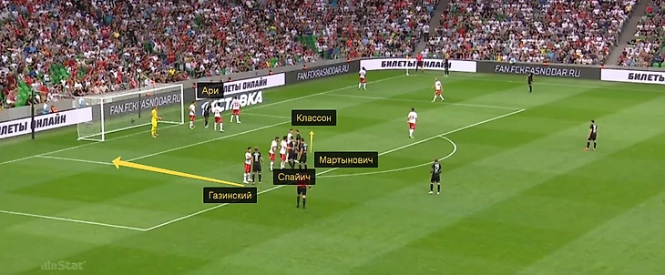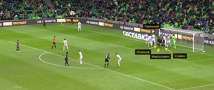 Весной «Краснодар» не всегда оставляет игрока во вратарской – например, в матчах с «Зенитом» и «Ахматом» Игнатьев 4 раза оставался на одной линии с четырьмя игроками, набегающими из глубины. В таком случае подача идет в центр на линию вратарской, где открываются Мартынович, Спайич и Газинский. Классон при таком расположении отрывается на дальнюю штангу.