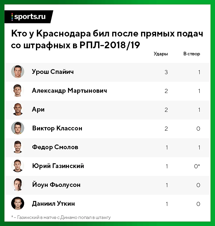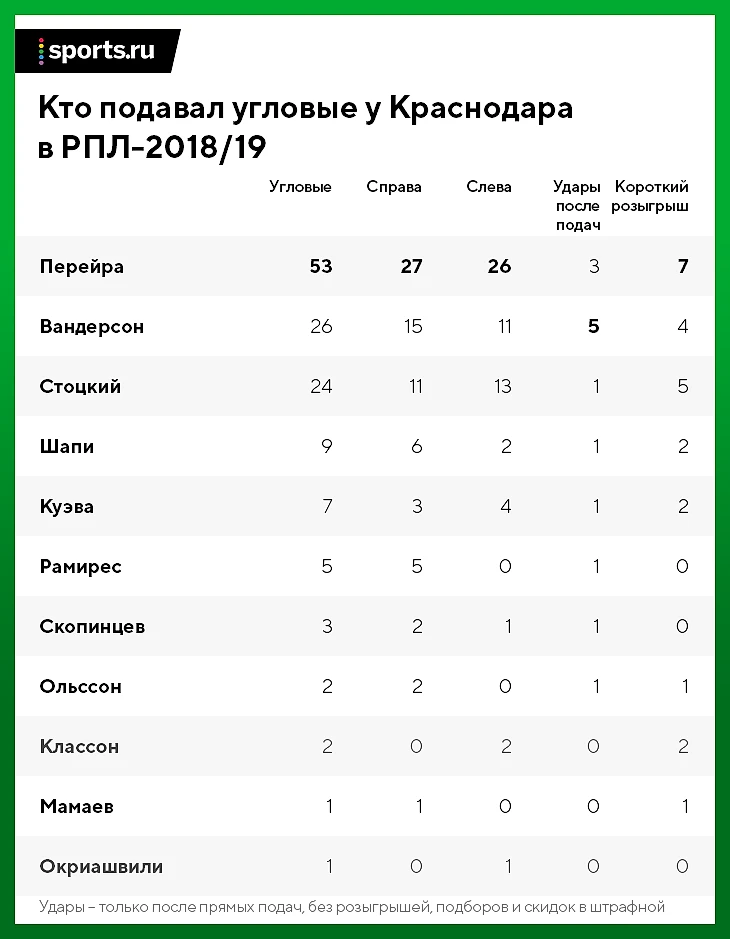 У «Краснодара» нет четкого разграничения: левша (хотя он почти всегда есть на поле) подает справа, правша – слева. Более того, Кристиан Рамирес, выполнивший 5 подач справа, ни разу не крутил мяч в ворота, а сделал 4 навеса на дальний угол вратарской или даже штрафной (например, в гостевом матче с «Рубином»).