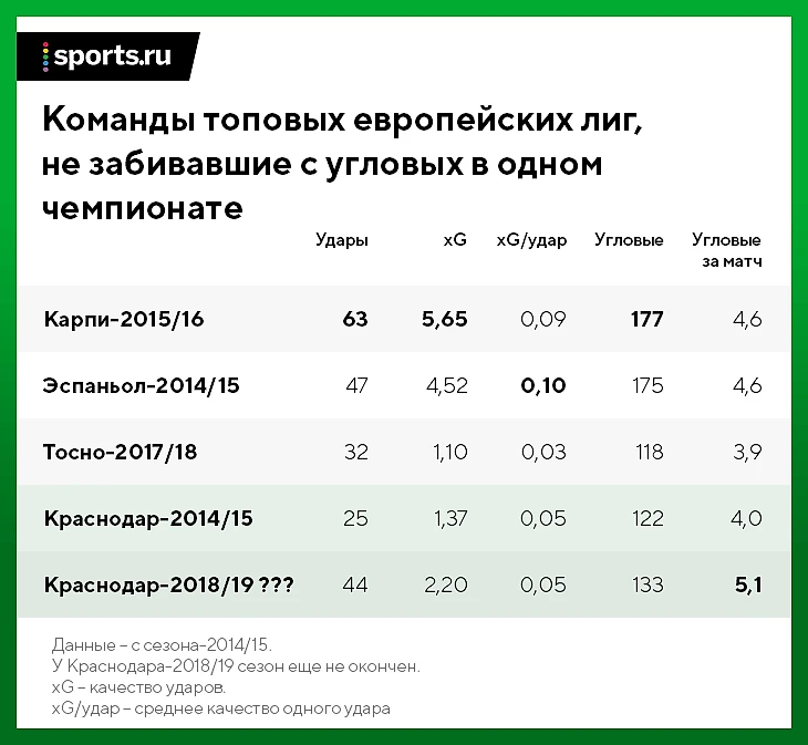 Оказывается, этот сезон – не худший в истории «Краснодара» с точки зрения угловых. «Тосно» вообще поставил антирекорд Европы по качеству ударов с угловых – и даже равное количество матчей с «Эспаньолом» и «Карпи» (в Испании и Италии – 38 туров, в России – 30) точно не спасло бы. При этом «Тосно» забил 4 гола после розыгрыша штрафных – то есть на примере угловых говорить об отвратном качестве всех стандартов нельзя.