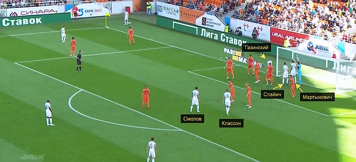 У Мусаева есть два варианта розыгрыша угловых, напоминающие схемы Кафанова. При одном вратарскую насыщают три игрока (всегда – Мартынович, остальные два – либо Спайич, либо Газинский, либо нападающий), а еще два (почти всегда один из них – Классон) остаются в центре штрафной.