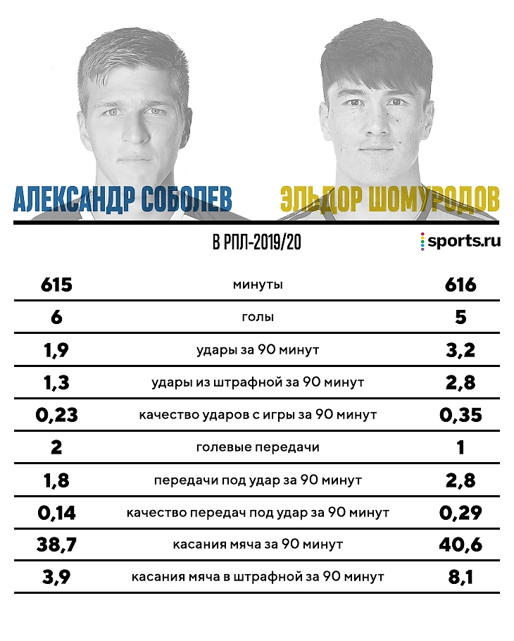 Из-за стиля «Крыльев» Соболев очень часто пасует назад и встречается с мячом за пределами штрафной. В этом между ним и Шомуродовым огромная разница: