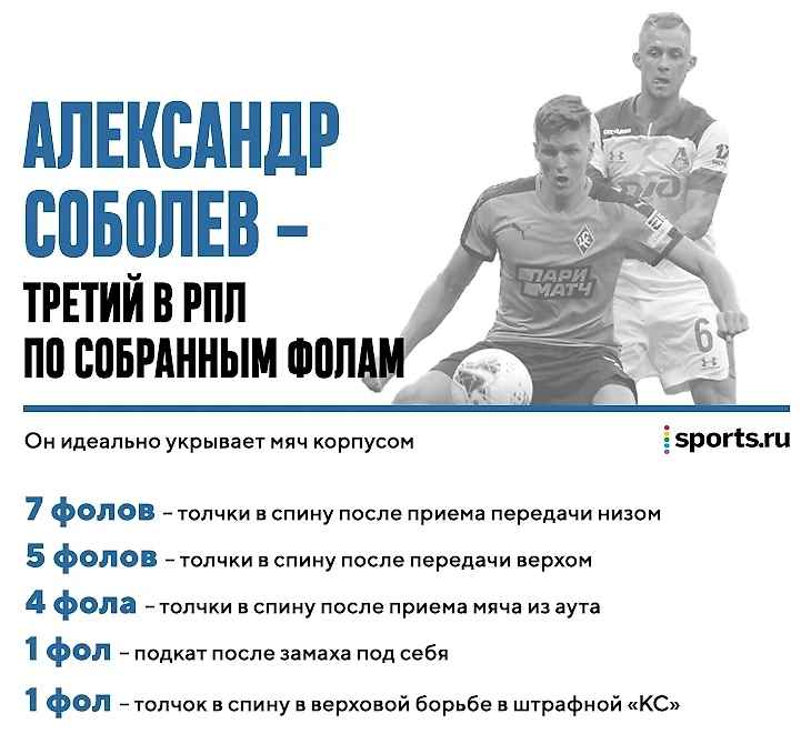 Результат – огромное количество нарушений на Соболеве. Например, в ФНЛ-2017/18 Александр был вторым по собранным фолам с отрывом в 28 нарушений от Андрея Часовских. Сейчас Соболев – третий по этому показателю в РПЛ (после Лесового и Кабутова). Правда, в этом сезоне нападающий «Крыльев» реже идет в обводку (0,7 попыток за 90 минут – карьерный антирекорд) и все фолы зарабатывает только за счет корпуса. Но это суперэффективно.