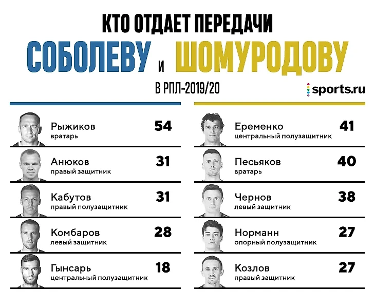 1) Шомуродов отдает 61,4% передач вперед (Соболев – только 40,2%),