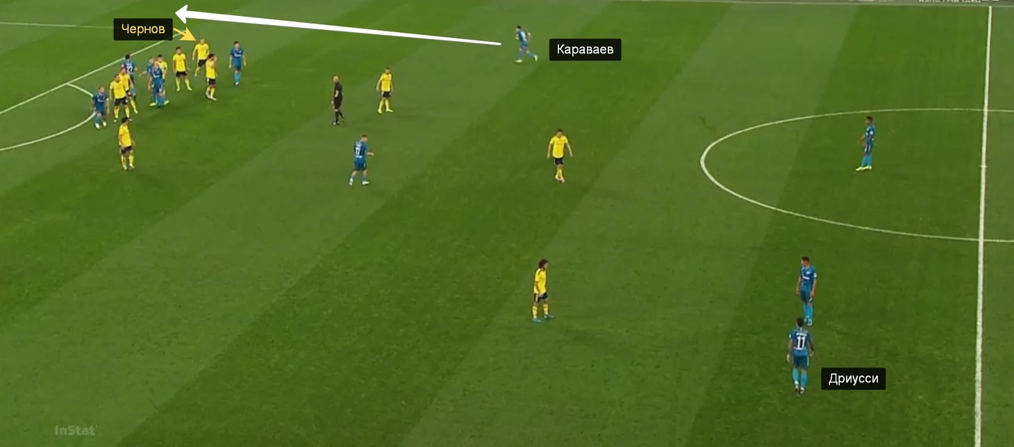 Но еще хуже центральных защитников сыграл Евгений Чернов, который в октябрьскую паузу спокойно работал с Карпиным. Второй гол «Зенита» – идеальное использование слабости Чернова при длинных передачах, которое проявлялось еще в прошлом сезоне. Дриусси не просто закинул мяч Чернову за спину – Караваев стартовал в ту зону в самый последний момент, что еще сильнее усложнило задачу для левого защитника «Ростова».