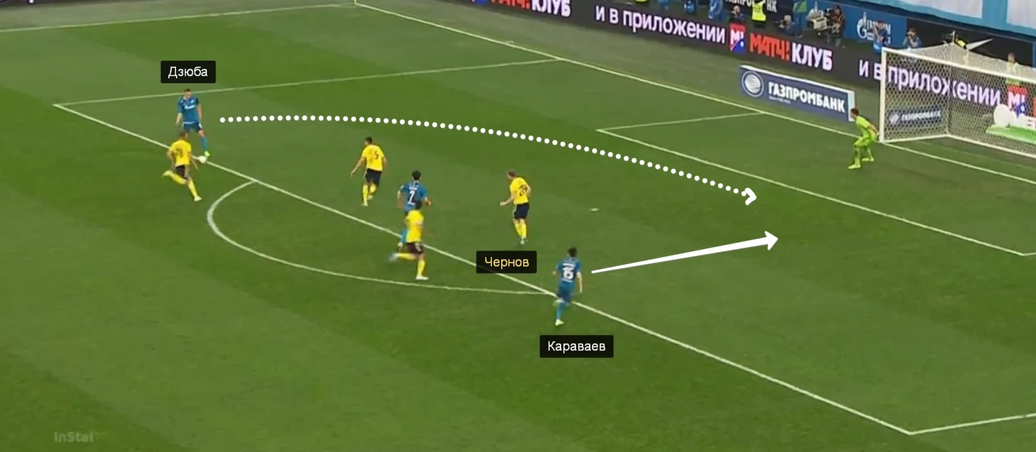 Замечательный по точности кросс от Дриусси, голевая передача в одно касание от Караваева и финальный точный удар Дзюбы. Да тут и более высококлассные защитники не смогли бы ничего сделать.