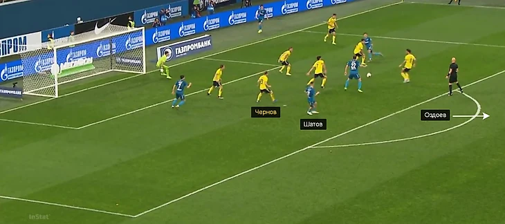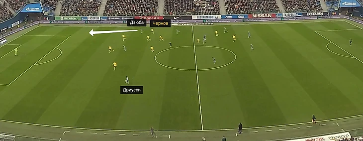Третий гол – снова заброс Дриусси в зону Чернова, на этот раз с игры. Рядом с крайним защитником при подаче оказался Дзюба – визуально это очень напоминало фишку «Зенита», которой он вынес еще «Фенербахче» (тогда вверху фланговых игроков уничтожал Азмун), но в этом эпизоде все произошло ситуативно. После классной и резкой передачи Оздоева, поменявшей фланг атаки «Зенита», Дзюба просто врывался в свободную зону, а Чернов его догонял. Догнал, но все равно провалился.