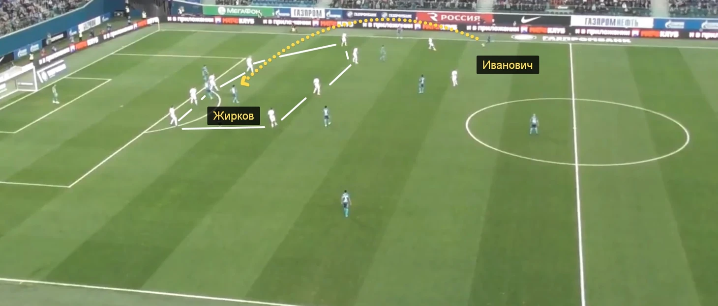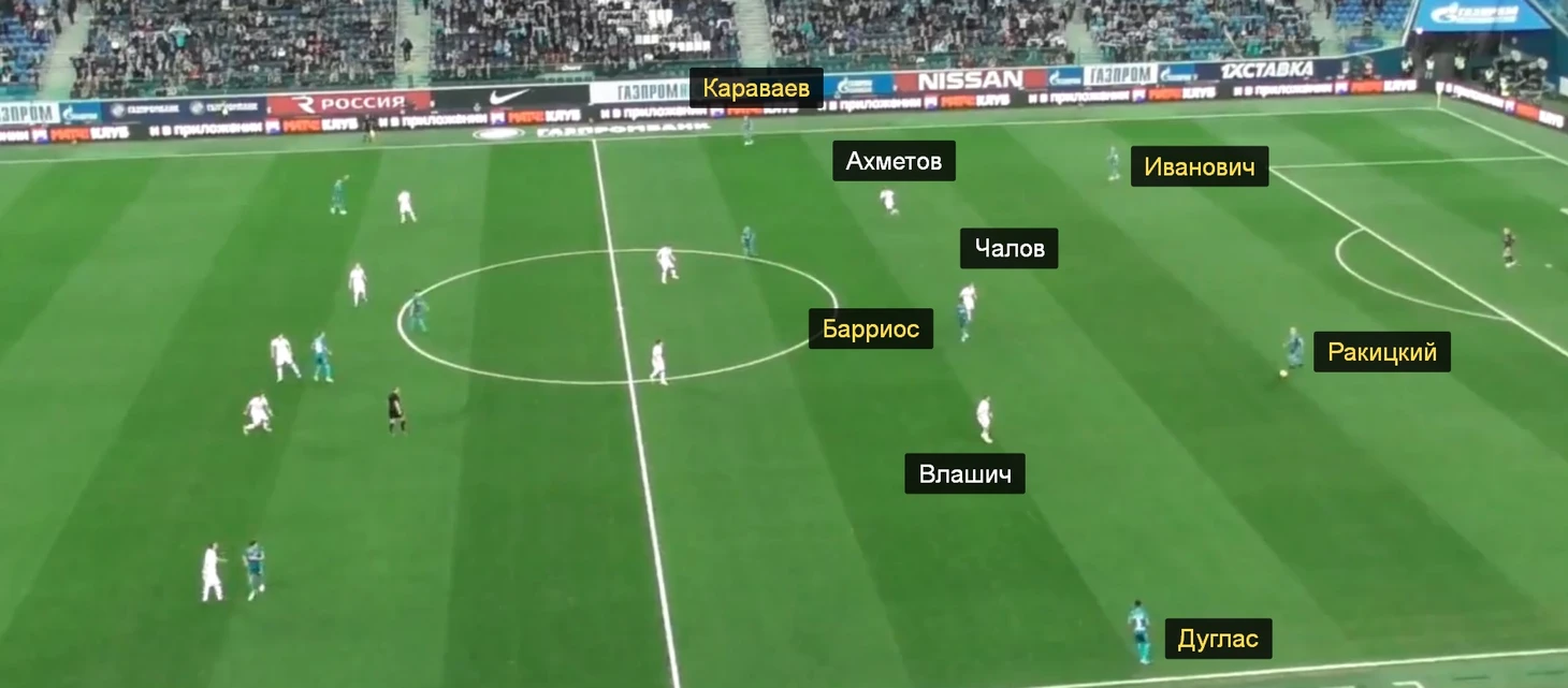 В самом начале матча Ахметов располагался ближе к левому флангу, а Влашич – к правому, по ходу первого тайма они менялись позициями, но гораздо важнее были их роли при прессинге. Чалов практически не атаковал Ивановича и Ракицкого, когда те были с мячом, а Ахметов и Влашич как выдвигались на центральных защитников «Зенита», так и опускались за фланговыми (Караваевым и Дугласом Сантосом) при развитии позиционной атаки хозяев.