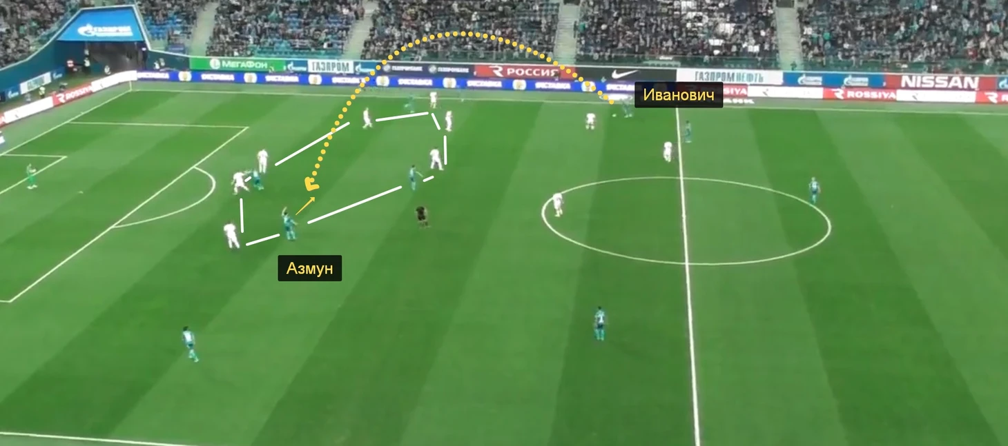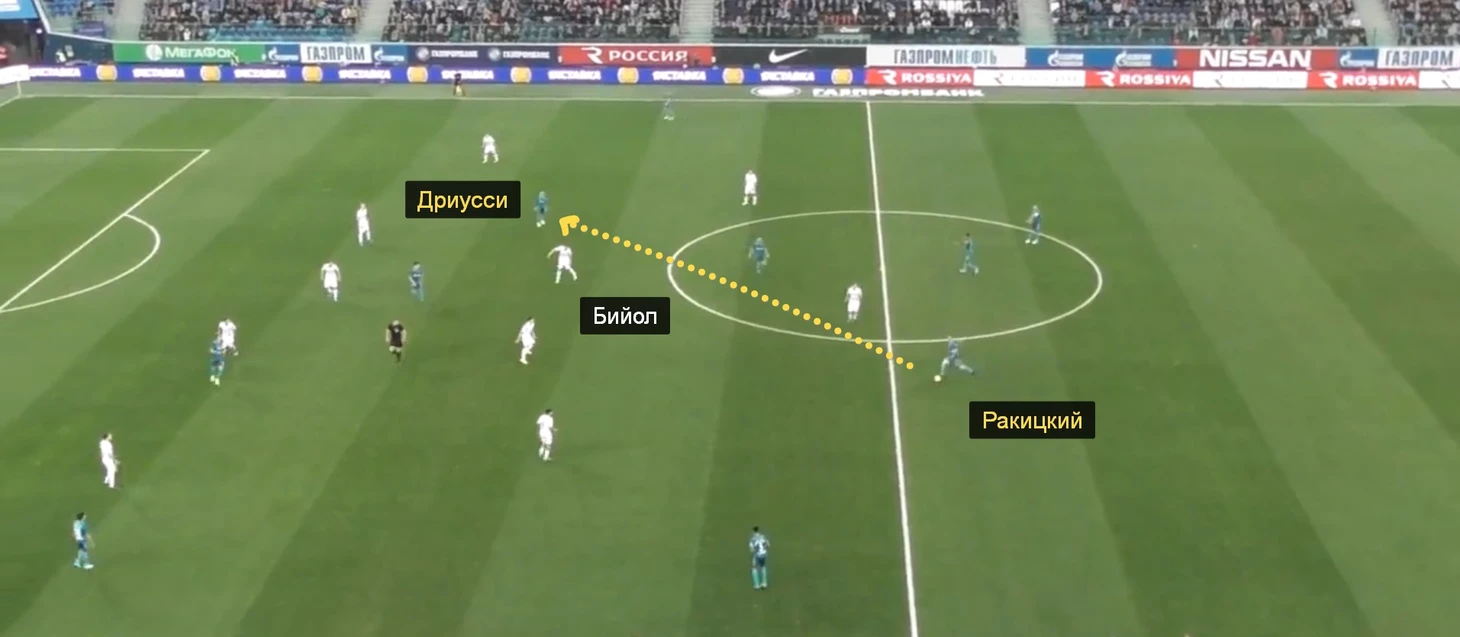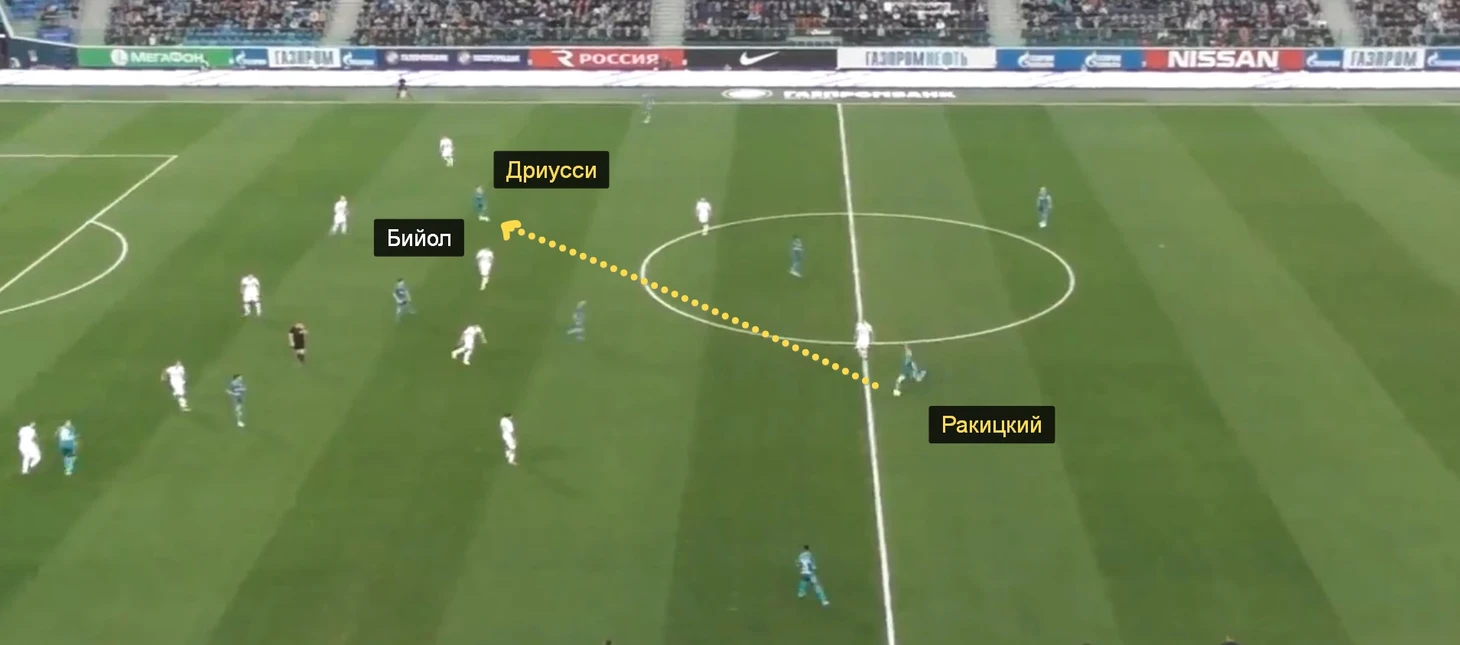 При этом за счет движения Дриусси (и в меньшей степени – Азмуна) «Зенит» все равно получал шанс организовать опасную позиционную атаку. Аргентинец часто получал мяч в правом полуфланге, иногда – за спиной Бийола.