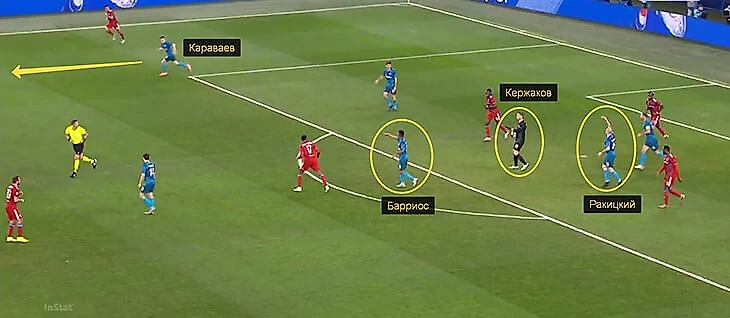 После этого Кержаков развернулся левее, а Караваев стал набирать скорость на правом краю. Кержаков даже показал партнерам, что нужно успокоиться, но затем снова повернулся вправо и увидел забегание Караваева. Его же заметили Барриос и Ракицкий – они показывали руками, куда нужно быстрее вводить мяч.