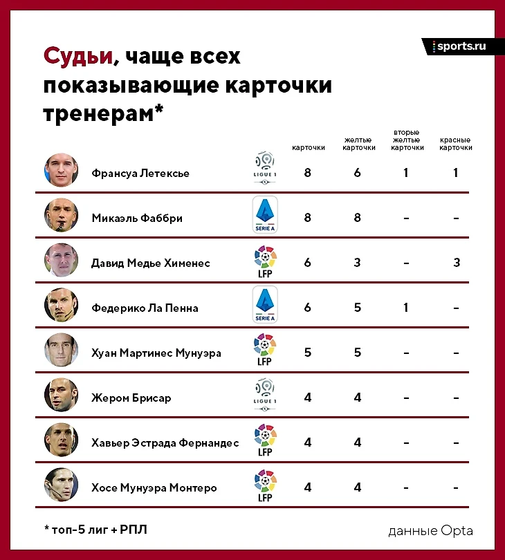 Лидеров сезона по удалениям тренеров среди судей вы вряд ли хорошо знаете – это 30-летний француз Франсуа Летексье и 36-летний итальянец Микаэль Фаббри, показавшие по восемь карточек в сторону скамеек. При этом Летексье дважды удалял тренеров (прямая красная Блакару и две желтых Андре Виллаш-Боашу в мартовском матче с «Амьеном»).