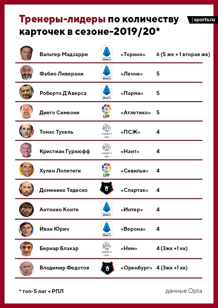 В РПЛ одиннадцать наказания получали 11 тренеров – Тедеско, Федотов, Миодраг Божович, Матвеев, Вадим Евсеев, Юрий Семин, Рашид Рахимов, Александр Точилин, Валерий Карпин, Виктор Гончаренко и Игорь Черевченко. Это больше, чем в АПЛ (6) и Бундеслиге (9), но меньше, чем в Лиге 1 (15), Ла Лиге (16) и Серии (17).