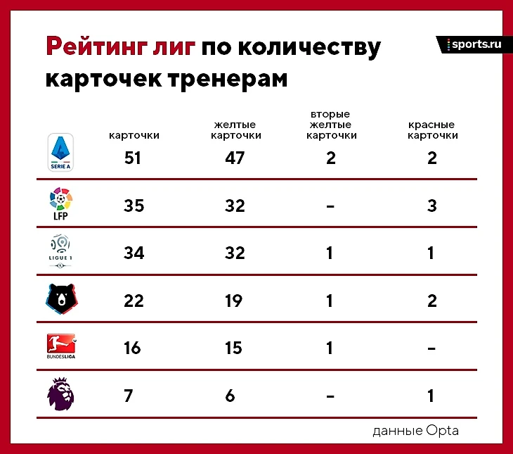 Интересно, что при такой жесткости к тренерам Фаббри реже всех в Серии А фиксирует нарушения игроков (27,73 за матч) и идет 12-м по количеству предупреждений за игру (5,36). С Летексье все проще – он чаще всех удаляет игроков в Лиге 1 (8 красных в 14 матчах).