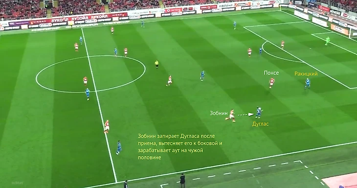 Игроки «Зенита» действительно опаздывали на пару шагов за одним-двумя спартаковцами (особенно этим грешили Дуглас и Ерохин) – это некачественная доработка футболистов, или «Зенит» планировал потери «Спартака» на своей половине и при таком прессинге? Если второе, то план не сработал – в первом тайме «Спартак» совершил лишь одну потерю в своей трети (при выходе из-под прессинга Зобнин немного далеко отпустил мяч, Малком помешал отдать точный пас, и мяч оказался у «Зенита»). Вряд ли это то, на что рассчитывал Семак при таком высоком расположении Дзюбы, Малкома, Ерохина и Мостового при начале атак «Спартака».