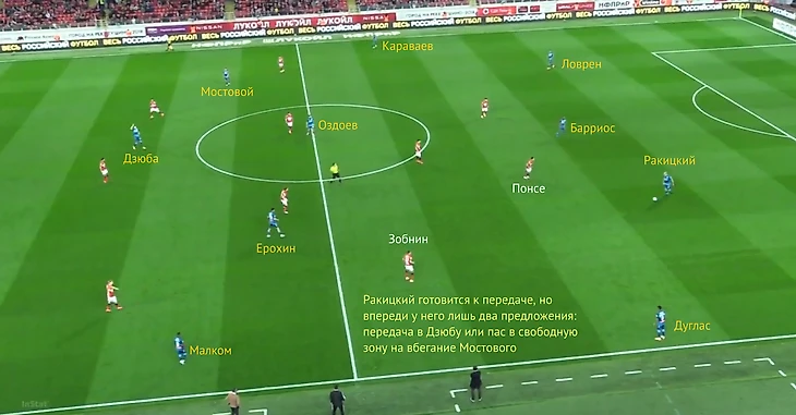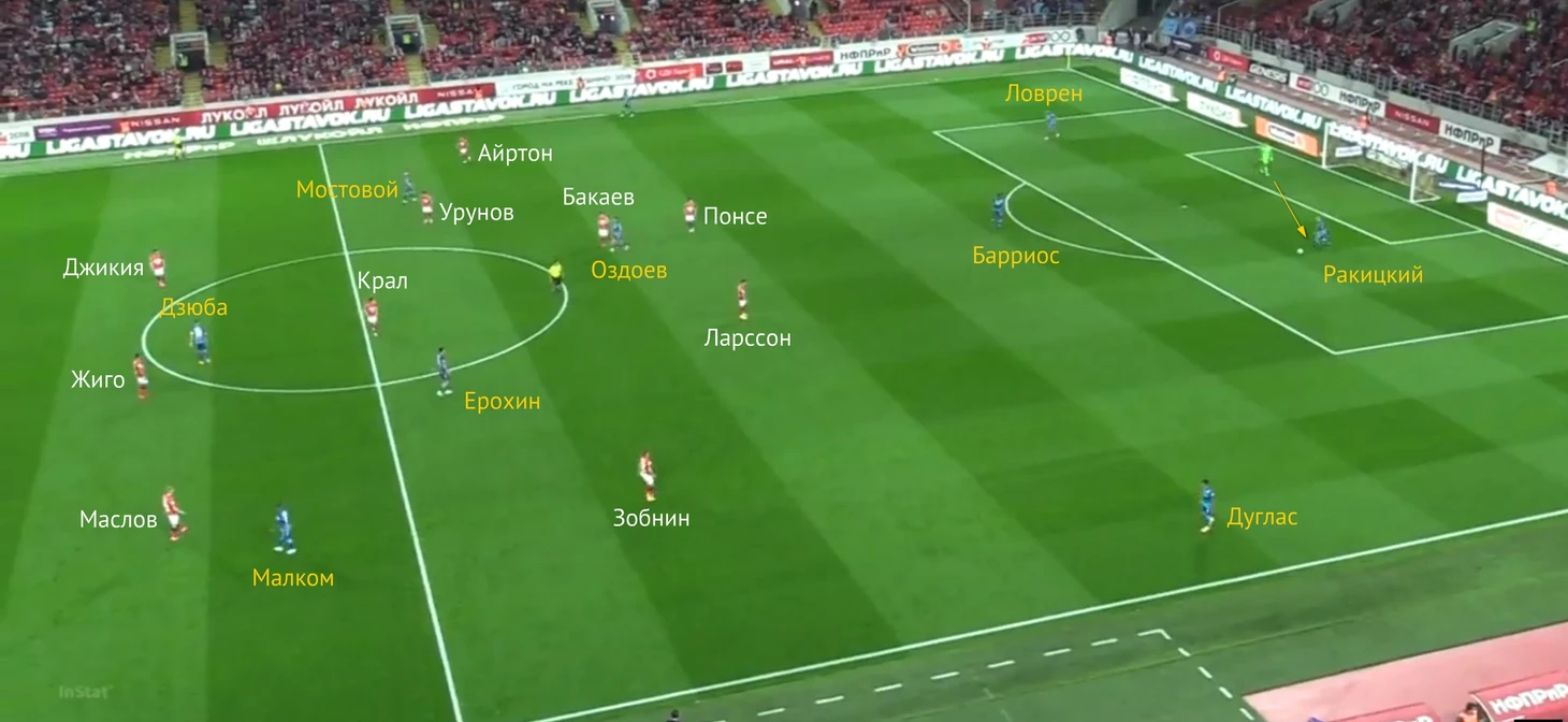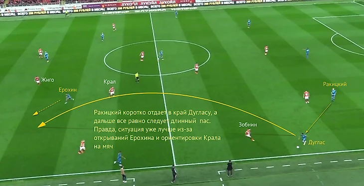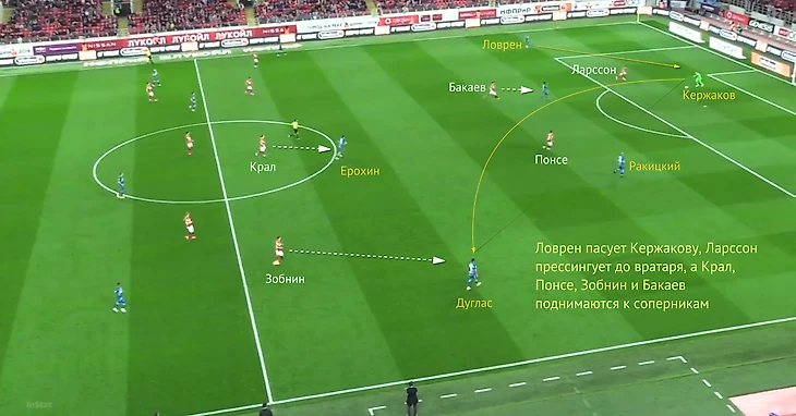 Прессинг «Спартака» вряд ли можно назвать суперинтенсивным – например, при ударах от ворот Кержакова москвичи никогда не встречали очень высоко, давая Ракицкому, Барриосу и Ловрену коротко разыгрывать. После таких розыгрышей «Зениту» было сложнее, чем обычно, выходить через вертикальную передачу верхом – рядом с Дзюбой не было Азмуна, а Ерохину нужно было еще успеть переместиться в первую линию атаки.