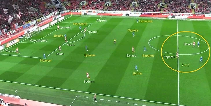 Неожиданно главным игроком «Зенита» стал Александр Ерохин, который располагался левее в тройке центральных полузащитников, но врывался вторым темпом гораздо чаще Оздоева (абсолютно логичное решение Семака). Ерохин находил пространство в опорной зоне «Спартака» (при перемещении атаки «Зенита» с фланга Крал и Урунов располагались слишком узко – например, при ударе Ерохина из-за штрафной), и цеплялся за мяч в штрафной (2 удара, в том числе очень опасный с разворота).