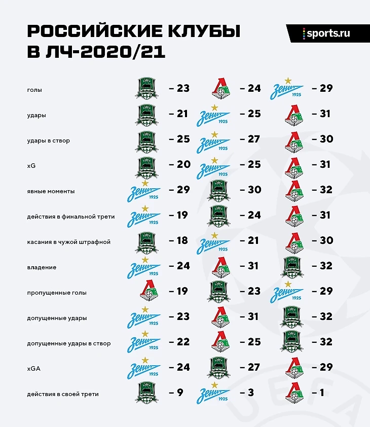 Причины неудач (у «Краснодара» – лишь по стилю и отчасти качеству игры, у «Локо» – по результату из-за ожиданий после четырех туров, у «Зенита» – вообще по всему) у наших клубов разные, но почти каждый статистический показатель ужасает – почти во всех минимум одна российская команда входит в четверку худших в Лиге чемпионов.