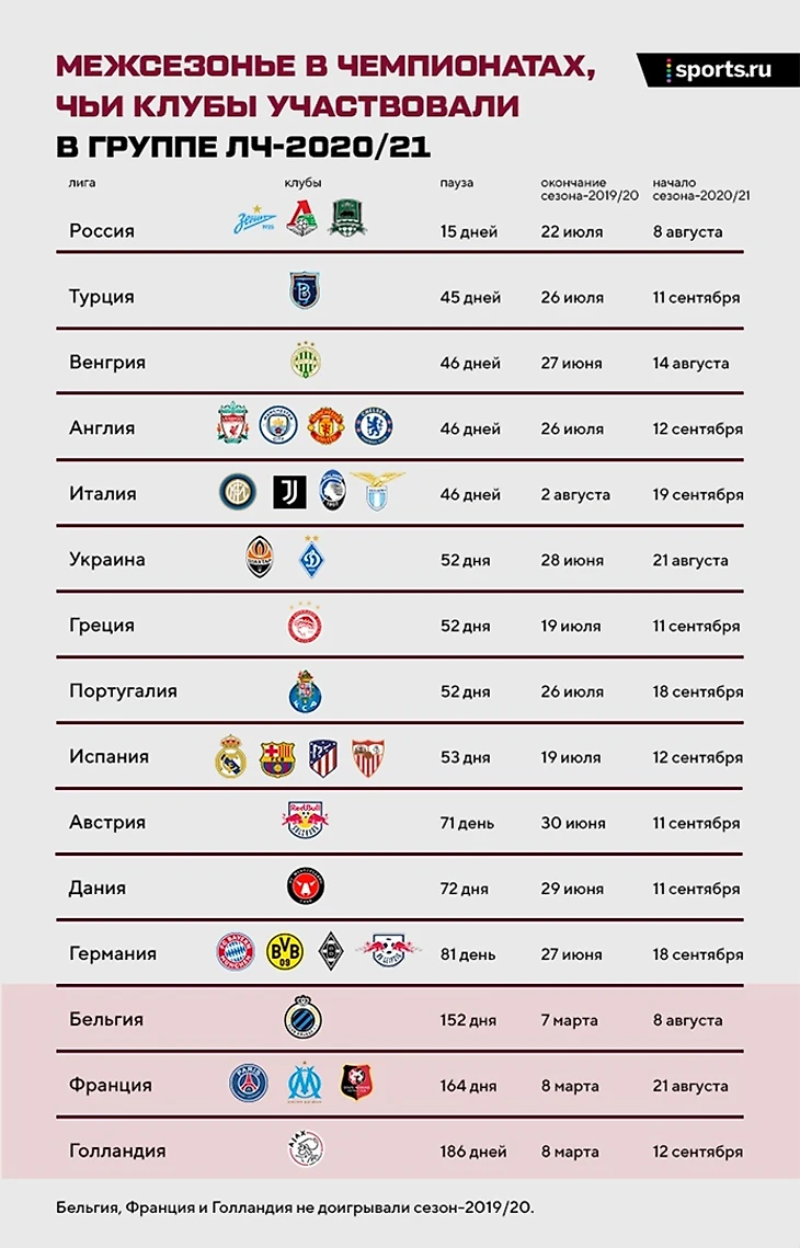 Все клубы, участвовавшие в групповом этапе Лиги чемпионов (конечно, кроме российских и участников решающих стадий ЛЧ и ЛЕ-2019/20), не играли официальных матчей минимум полтора месяца – в это время они отдыхали и проводили мини-сборы.