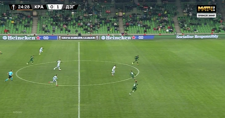Пас получился неточным – «Динамо» убежало 4-в-3 и организовало выход один на один. «Краснодар» спас Городов.