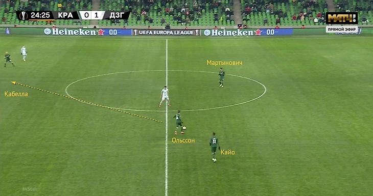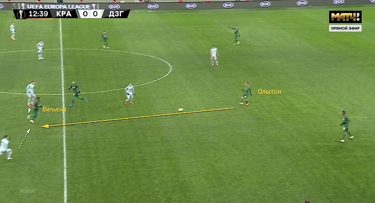 Особенно плох был Ольссон, при старте позиционных атак чаще других оказывавшийся рядом с Мартыновичем и Кайо. Вот, например, вертикальная передача низом на Вильену, которого сзади накрывают два игрока «Загреба».