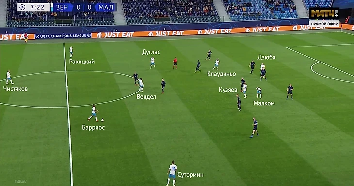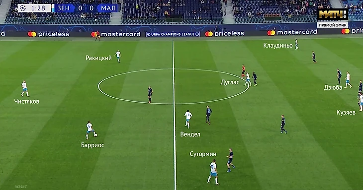 Третий матч подряд «Зенит» начал в одном и том же составе, четвертый – с тройкой центральных защитников (в том числе – Вильмаром Барриосом) и одним нападающим (с «Челси» им был Сердар Азмун, против «Рубина», «Крыльев Советов» и «Мальме» – Артем Дзюба).