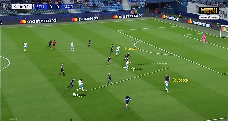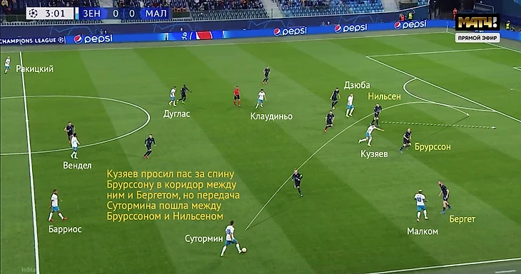 Против «Мальме» Кузяев снова был близок к позиции второго нападающего, хотя по стартовым раскладам должен был располагаться рядом с Венделом. Смещения Дугласа в середину позволили Кузяеву подниматься и искать свободное пространство между защитниками «Мальме».