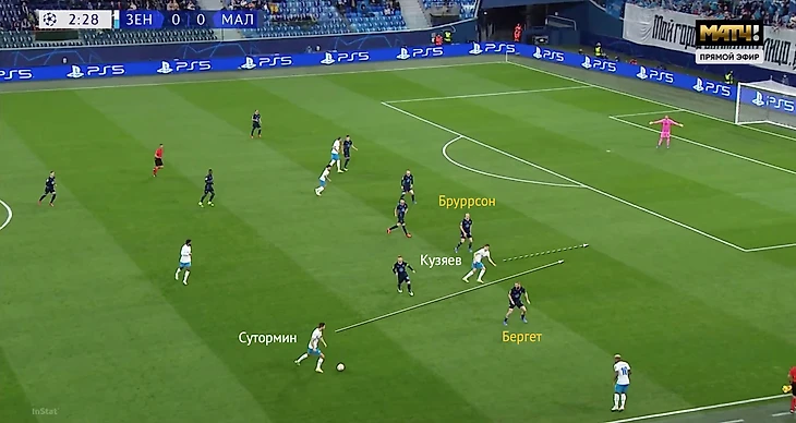 Два момента «Мальме» возникли сразу после стартового доминирования «Зенита», но природа у них была разной. Удар Чолака – следствие прессинга «Мальме» и обреза Сутормина, удар Кристиансена – смелой формации Семака и недоигровки Малкома, который по эпизоду отвечал за Кристиансена. Та атака началась с выхода «Мальме» из-под прессинга и обнажила, вероятно, основную оборонительную проблему в варианте, выбранном Семаком под шведов.