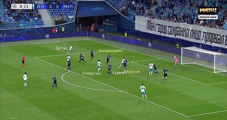 Больше всего удивила гибридная роль Дугласа Сантоса. При обороне он ожидаемо был левым латералем (в том числе поднимался в прессинг по правому латералю «Мальме» Ларссону), но при позиционных атаках «Зенита» постоянно уходил в середину.
