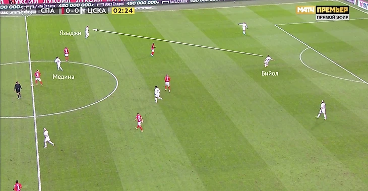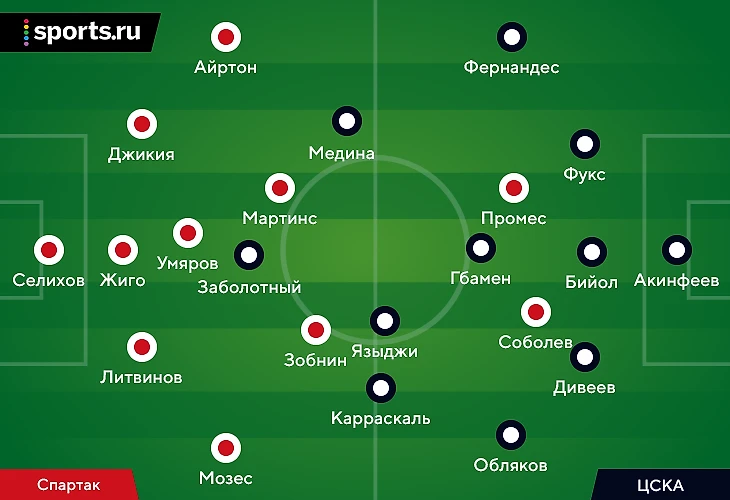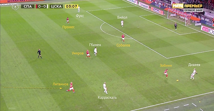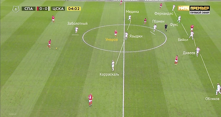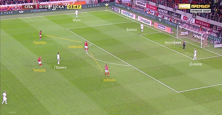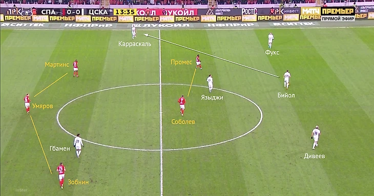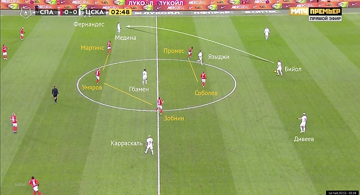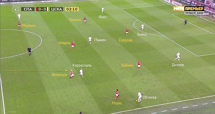 Промес и Соболев лишь номинально встречали тройку защитников ЦСКА (то есть не давили на игрока с мячом), тройка Зобнин – Умяров – Мартинс располагались на своей половине.
