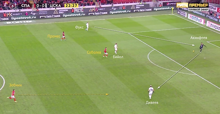 Эта ставка могла сыграть уже на 4-й минуте, когда после высокого прессинга «Спартака» и лично Зобнина против Дивеева защитник ЦСКА выкатил мяч в середину на Промеса.