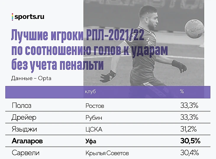 По точности ударов Агаларов по-прежнему лучший в РПЛ (57,1%), на втором месте – Полоз (55,5%), на третьем – Матео Кассьерра (47,6%). По соотношению голов к ударам без учета пенальти Агаларов входит в топ-5.
