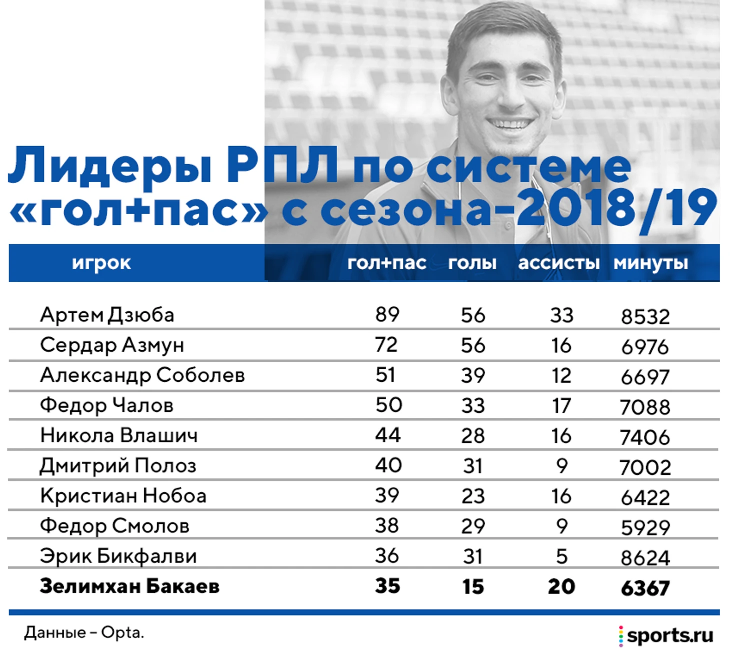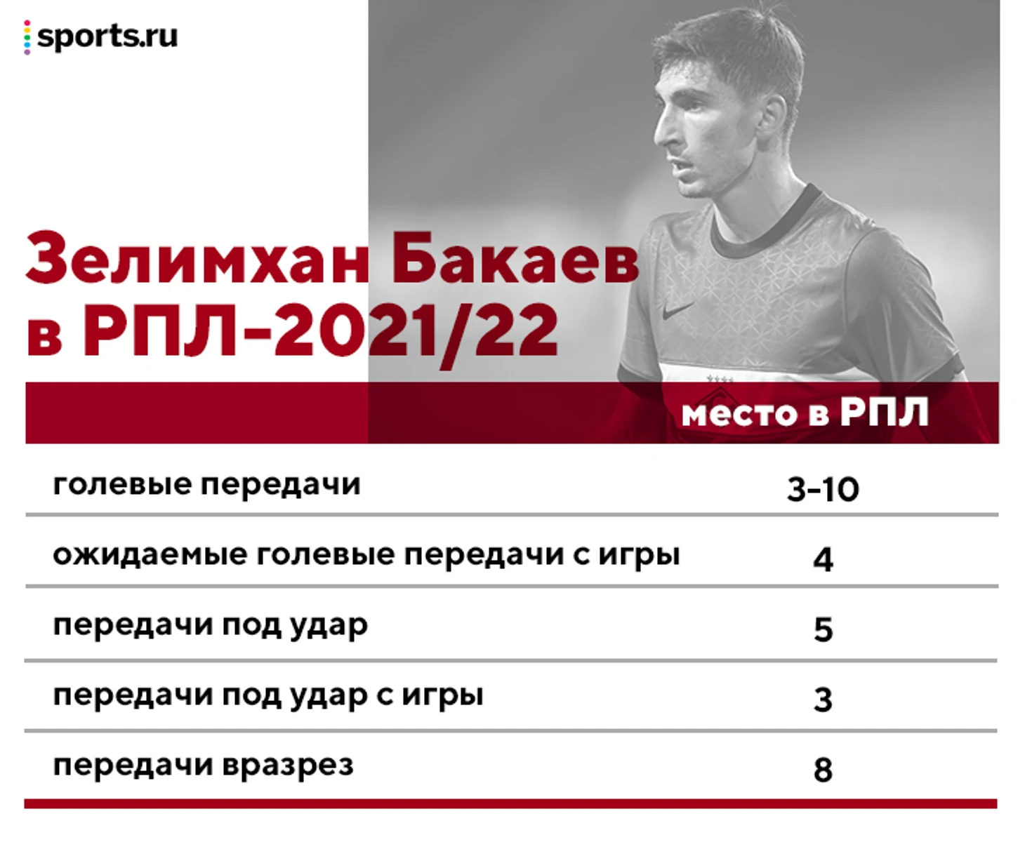 По системе «гол+пас» Бакаев входит в топ-10 с сезона-2018/19 – первого полноценного во взрослом футболе (тогда он играл в тульском «Арсенале»).