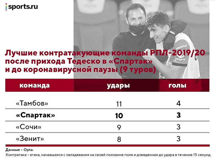 Лучшую игру контратакующего «Спартака» Тедеско мы увидели еще осенью 2020-го – тогда разгромили «Локомотив» (3:0). Бакаев отметился ассистентским хет-триком – все голевые передачи пришлись на быстрые отрывы.