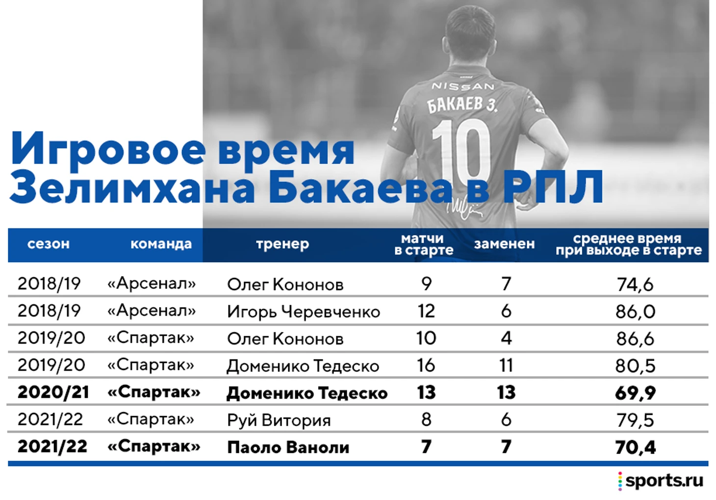 Тогда это происходило в первой части (ноль матчей с первых минут весной 2021-го) и объяснялось последствиями коронавируса. Сейчас внятных и детальных пояснений мы не получили, хотя они требовались даже больше, чем при Тедеско, ведь к игре Бакаева уже было не так много претензий.