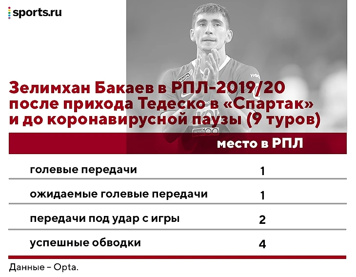 Превращение Бакаева в игрока ротации совпало со сменой стиля «Спартака». Благодаря появлению Павла Маслова москвичи коротко разыгрывали от вратаря Александра Максименко и подолгу контролировали мяч. До коронавирусной паузы (в лучший отрезок Бакаева при Тедеско) «Спартак» имел 50,3% владения, в доигровке сезона-2019/20 – 52,5%, а в первой части 2020/21 – аж 59,3%.