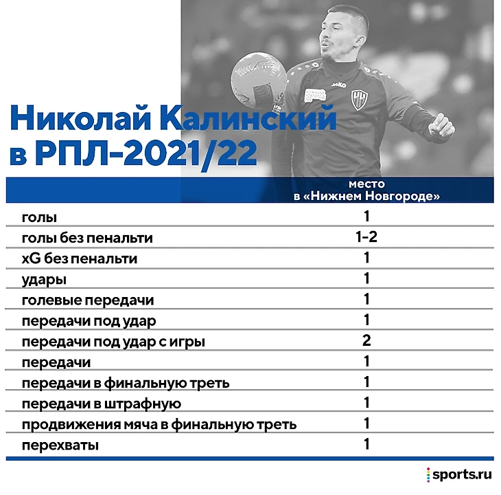 4 ассиста со стандартов оформил Николай Калинский – лучший игрок «Нижнего Новгорода»-2021/22. Калинский – вообще лидер РПЛ по количеству передач под удар со стандартов (37, у Себастьяна Шиманьского – 25), а также первый в «Нижнем» сразу по нескольким ключевым показателям.