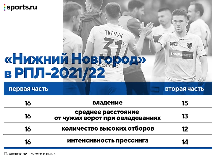На октябрьскую паузу из-за сборных «Нижний» ушел на восьмом месте – со стилем все было уже ясно. Игра в очень низких блоках в 5-4-1 или 5-3-2, почти полное отсутствие свободных зон на своей половине поля с редкими попытками контратаковать. Главное атакующее оружие – стандарты Николая Калинского.