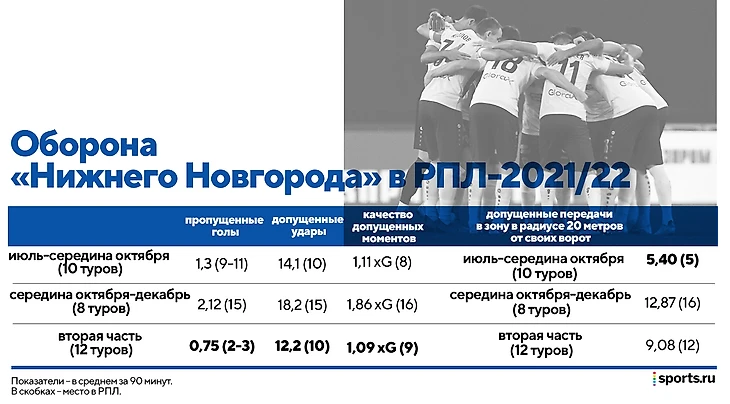 «Нижний» сильно просел только во второй половине осени 2021-го, но важен и контекст. С середины октября до середины ноября нижегородцы сыграли в гостях с «Крыльями Советов» (0:2), «Ахматом» (1:3), «Зенитом» (1:5), а также дома с «Краснодаром» (1:4) и «Локомотивом» (1:2).