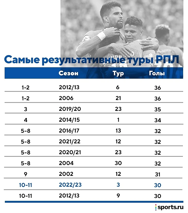 В топ-11 самых результативных туров в истории РПЛ – лишь два стартовых: первый в сезоне-2014/15 (34 гола) и третий в этом (30 голов). В топ-27 – 11 на отрезке с 21-го по 30-й тур (40,7%), по восемь – на отрезках с 1-го по 10-й тур и с 11-го по 20-й (по 29,6%).