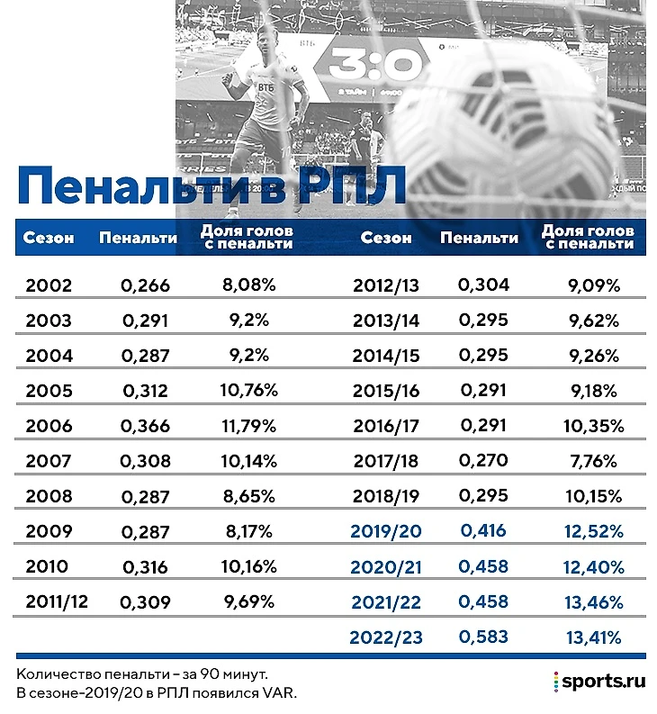 Данные по количеству пенальти за 90 минут (рекорд – у этого сезона) дарят новую теорию: летом 2022-го в России рекордно много забивают, потому что ставят слишком много пенальти.