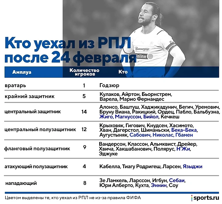 Кроме того, из РПЛ уехали сильные атакующие легионеры – Себастьян Шиманьски, Вандерсон, Виктор Классон, Реми Кабелла (вообще основная тройка «Краснодара», когда все были здоровы), Понтус Альмквист, Хвича Кварацхелия, Андерс Дрейер, Сеад Хакшабанович, Чидера Эджуке. Юри Алберто и Ян Кухта поиграли в России совсем немного, но их класс тоже очевиден.