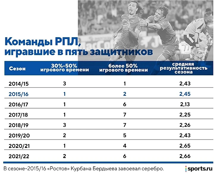 Кажется, Гончаренко наиболее точно выразил причины трансформации РПЛ в лигу автобусов. Например, за сезон до серебра «Ростова» в лиге всего одна команда провела более 50% игрового времени с пятью защитниками. После серебра «Ростова» таких команд было уже шесть.