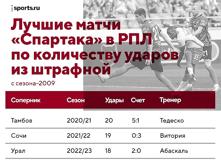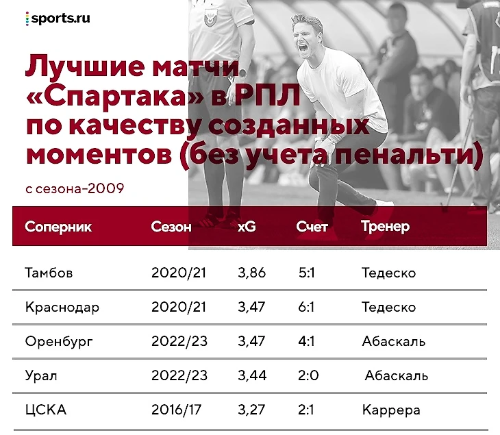 Против «Урала» «Спартак» набил 3,44 xG – это четвертый результат для команды, если не учитывать пенальти. Теперь топ-5 выглядит так: