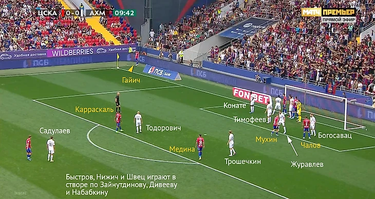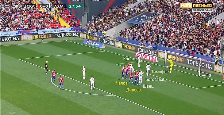 Перед подачей Медины дальним игроком ЦСКА в штрафной оказывался Дивеев (по нему играл Швец), который располагался сразу за Чаловым (по нему – Богосавац).