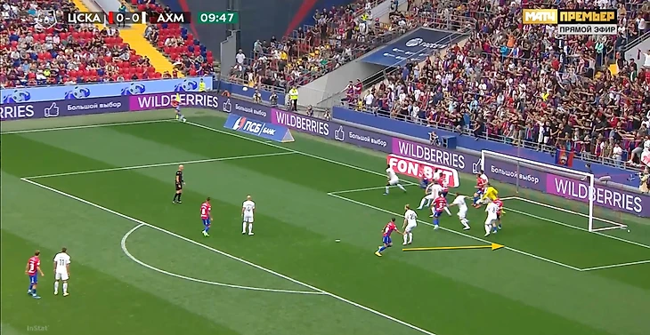 Все пять подач ЦСКА выполнил на дальнюю штангу. Когда Гайич подавал слева, важная роль отводилась Чалову – он смещался к центру вратарской и уводил за собой Богосаваца, освобождая дальнюю штангу. В освободившуюся зону врывался Медина.