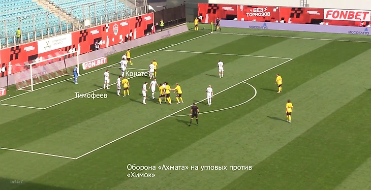 В штрафной «Ахмат» разбирал соперника один-в-один, зонно оборонялись двое игроков – Мохамед Конате и Артем Тимофеева. Конате всегда находился на ближнем углу вратарской, Тимофеев – в ее центре.