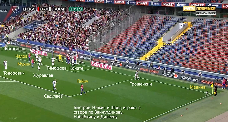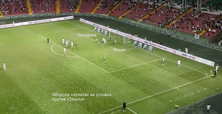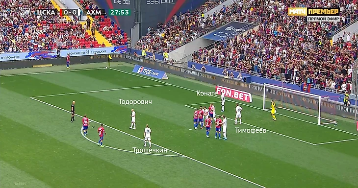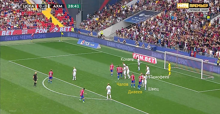 В двух матчах перед ЦСКА «Ахмат» оборонялся так же, как и против армейцев. Нападающий (Конате или Владимир Ильин) и Тимофеев играют в зоне, Артем располагается дальше от точки подачи.