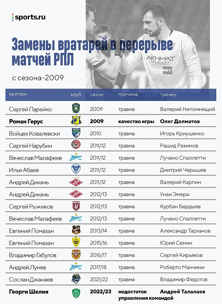 Opta ведет подсчет данных в РПЛ с сезона-2009. За четырнадцать сезонов тренеры меняли вратарей в перерыве 16 раз – не так уж и мало, но история Талалаева и Шелии все равно почти уникальна. С 2009-го только двух вратарей меняли не из-за травм: Романа Геруса в матче «Ростов» – «Кубань» в сезоне-2009 (3:3) и Шелию в игре с ЦСКА.