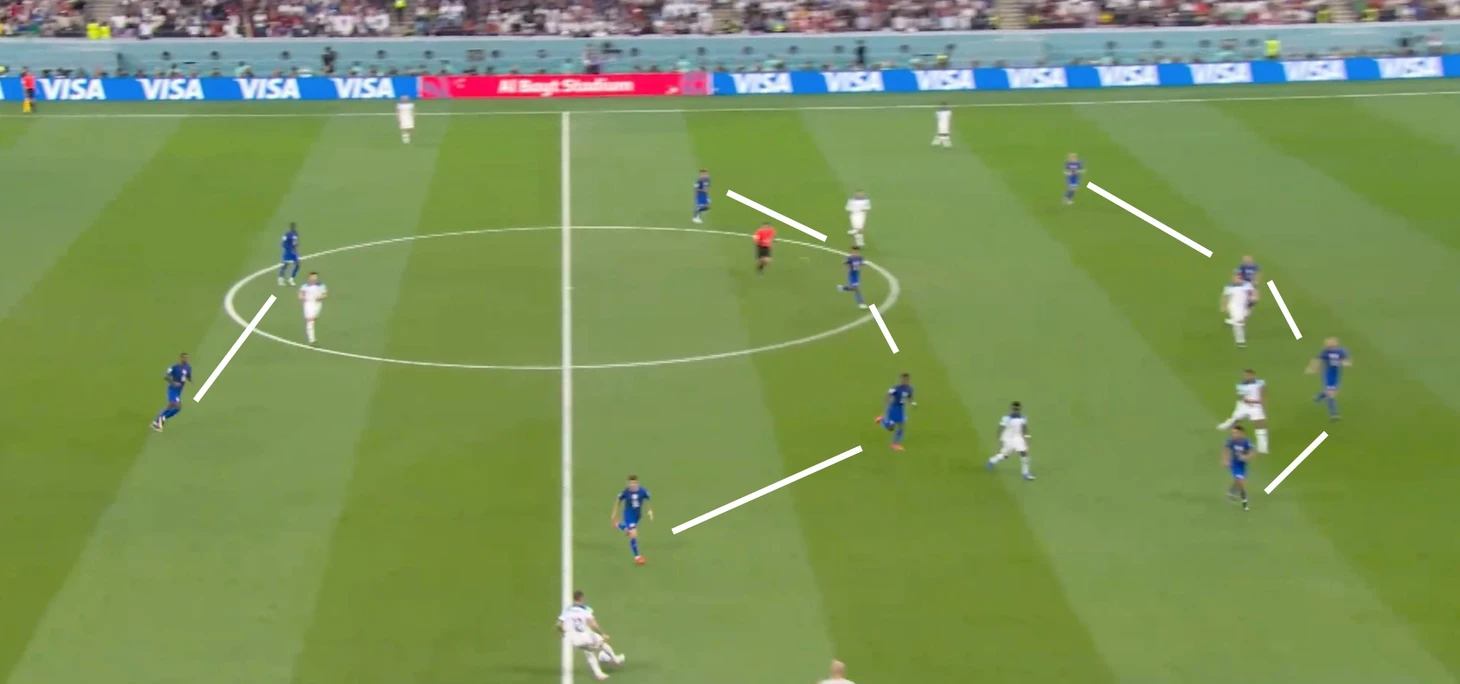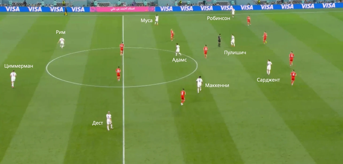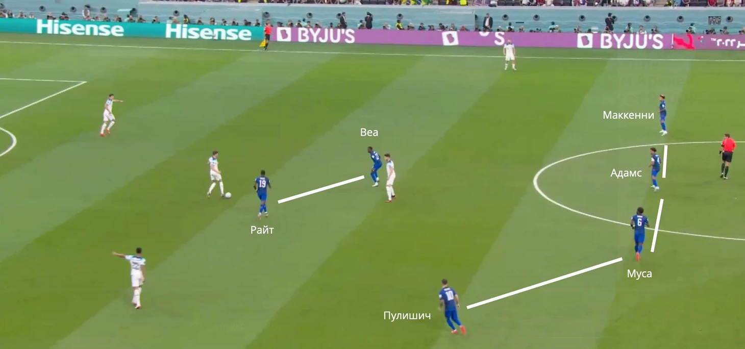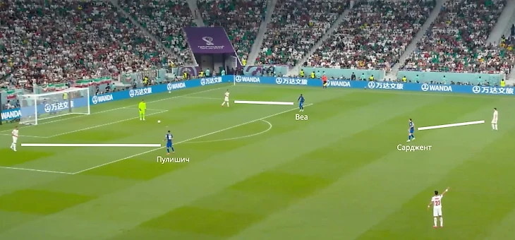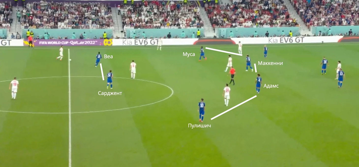 Иран играл в четыре защитника. Пулишич и Веа разбирали обоих центральных защитников (например, при розыгрыше Ирана от ворот), а Сарджент опускался к опорнику.